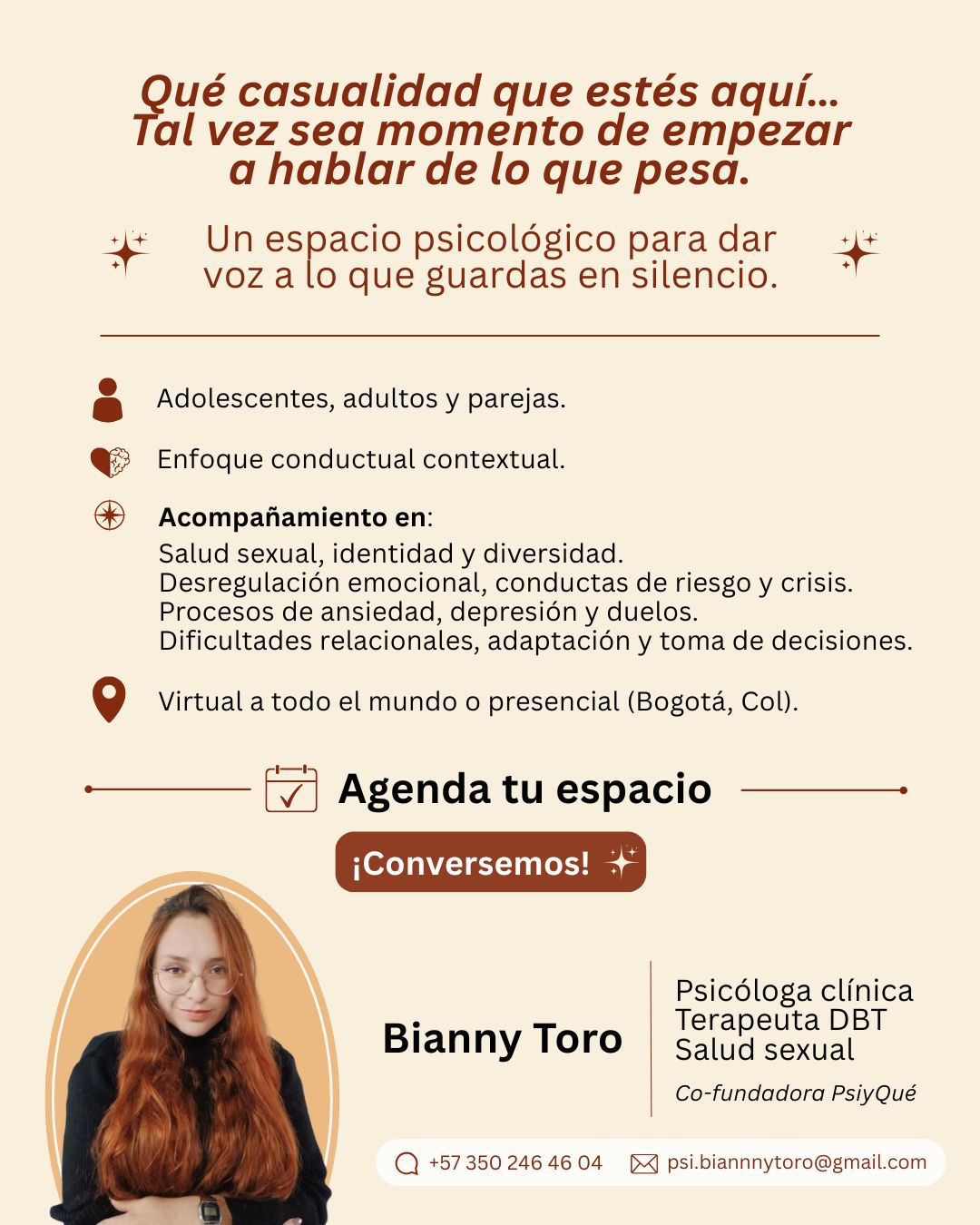 Cuento con experiencia en el acompañamiento de procesos relacionados con regulación emocional, ansiedad, depresión, duelo, rupturas afectivas, dificultades vinculares, autoestima, identidad, salud sexual, diversidad sexual y crisis vitales. También trabajo en distintas etapas del ciclo vital de la mujer, como ciclo menstrual, embarazo, posparto, perimenopausia y menopausia.